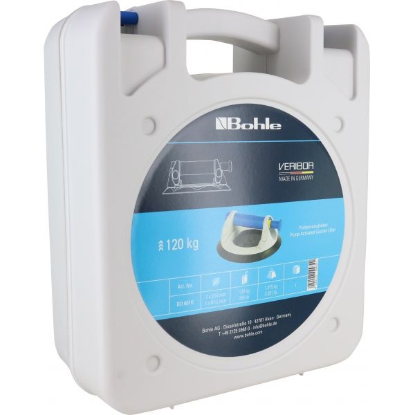 Bohle, The Veribor® pump suction lifter BO 601G is equipped with a vacuum safety indicator that is clearly visible from a distance and with numerous functional details. The vacuum can be built up particularly quickly using the high-quality pump mechanism and the large valve button. This makes it easier to attach the suction lifter to the material and remove it more easily after use. A raised handle area also offers the best wearing comfort. A plastic ring placed over the rubber disc provides even more stability and protection. The pump suction lifter is suitable for all materials and objects with gas-tight surfaces. The high quality of this product has been confirmed by the TÜV by awarding the GS mark. Load capacity: 120 kg, material: plastic, surface geometry: flat, suction disc: √∏ 214 mm